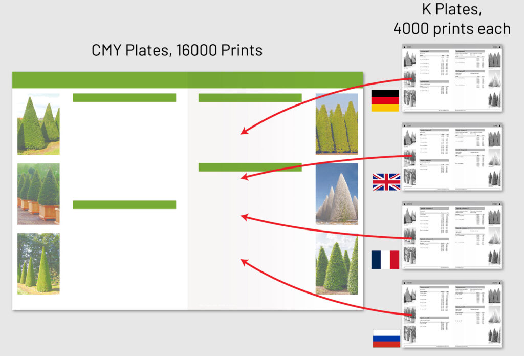 Beyond layout and document control, the most significant impact of this approach was achieved at the printing stage. Instead of producing a full CMYK plate set for each language, the catalog was prepared for a shared-plate workflow. Cyan, Magenta, and Yellow plates were printed once for the full 16,000-copy run, as they contained only shared image content. The Black plate, which carried all language-specific text, was printed separately for each language in runs of 4,000 copies.