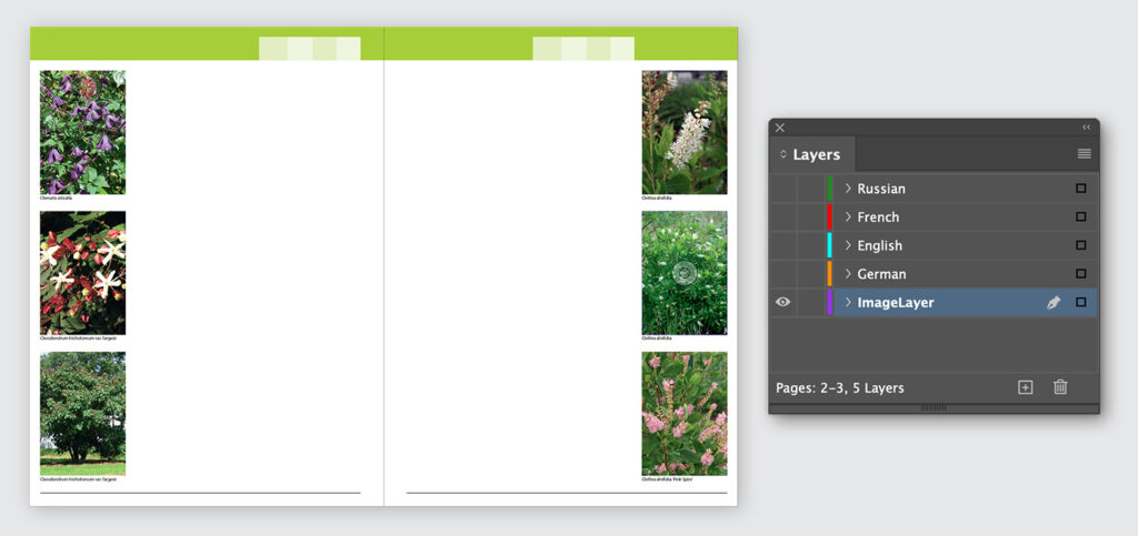 The new InDesign document was built around a separation-aware, layer-based structure. All images and graphical elements were placed on a dedicated bottom layer, while each language was assigned its own text layer above it. Text was strictly limited to black only, ensuring clean color separations and predictable plate output. This architecture allowed languages to be activated or deactivated at output stage without affecting layout, positioning, or pagination.