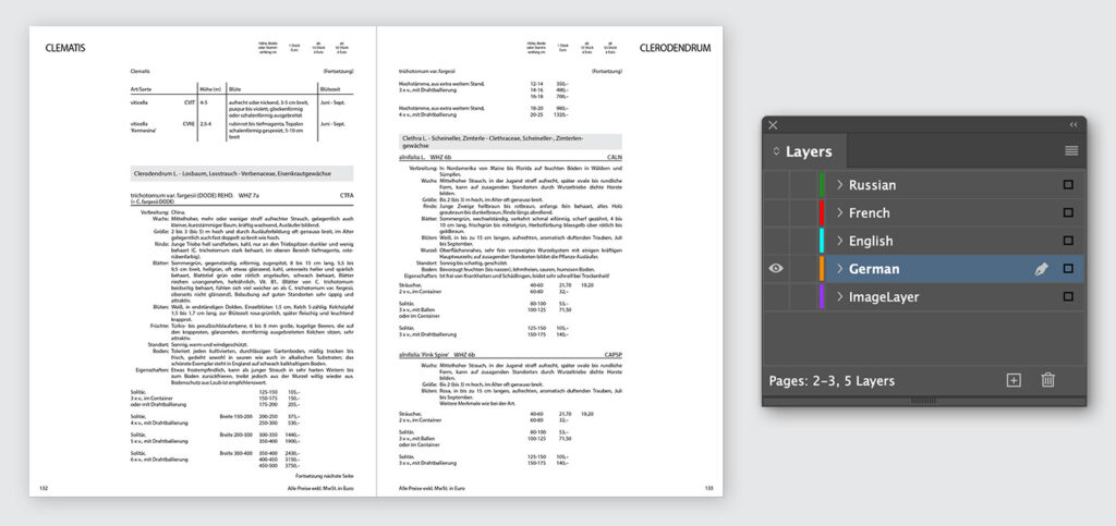 The goal of the relayout was not merely to migrate the catalog to Adobe InDesign, but to redesign the document architecture so that all language versions could be managed within a single production file. A central requirement was that every plant entry start on the same page number in all four languages, regardless of language-specific text length differences. This constraint applied across all chapters, from highly structured plant listings to more editorial sections such as design guides, climate zones, and reference content.