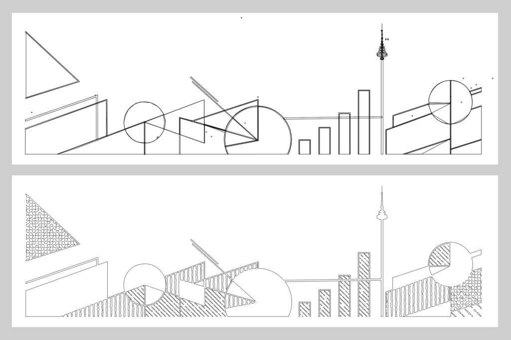 Within the design, a minimum distance of five millimeters between elements was required to avoid weak points. However, in areas with thin vertical shapes, such as the tower, the cut line had to be positioned only ten millimeters away from the print to preserve structural strength and prevent the foil from tearing during handling or installation.