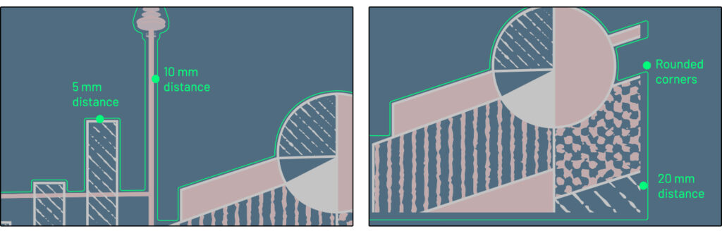 Because of these varying requirements, a simple offset path was not sufficient. The cut contour had to be manually constructed and adjusted around different parts of the artwork, balancing ease of cutting, visual consistency, and material stability.