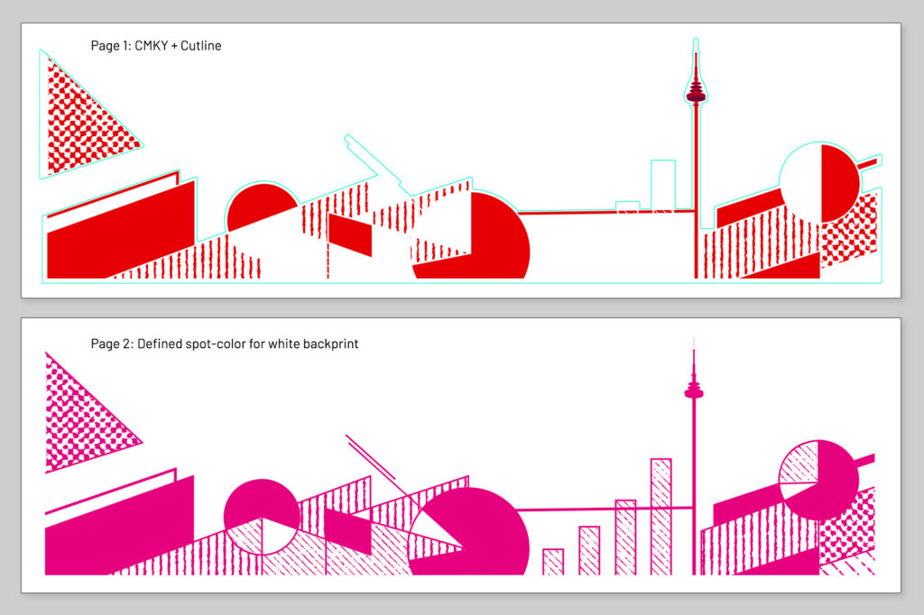 Because the foil was transparent, all red printed areas required a perfectly aligned white underlayer. To ensure correct print sequencing and registration, the artwork had to be divided into two separate print pages. One page contained the CMYK print elements, in this case only red, together with the technical cut line. The second page contained only the white backprint elements.